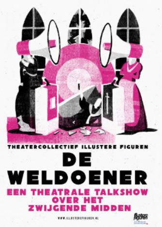 Een theatrale talkshow "De Weldoener", over het zwijgende midden, door theatercollectief Illustere Figuren.